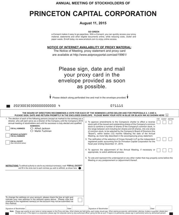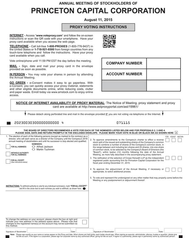The enclosed proxy statement is also available at www.princetoncapitalcorp.com (under the “Investor Relations” section). This website also includes copies of the form of proxy and the Company’s Annual Report on Form 10-K for the year ended December 31, 2014 (the “Annual Report”). Stockholders may request a copy of the proxy statement and the Company’s Annual Report by contacting our main office at (713) 595-1460.