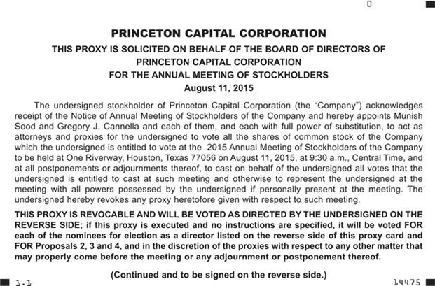 You are cordially invited to attend the 2015 Annual Meeting of Stockholders (the “Annual Meeting”) of Princeton Capital Corporation to be held on Tuesday, August 11, 2015 at 9:30 a.m., Central Time, at One Riverway, Houston, Texas 77056. Only stockholders of record at the close of business on June 22, 2015 are entitled to the notice of, and to vote at, the Annual Meeting, including any postponement or adjournment thereof.