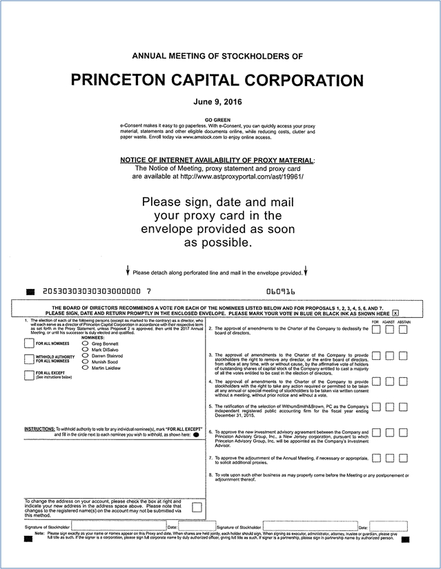 This letter is written in response to oral comments received from the Staff of the Division of Investment Management on May 13, 2016, relating to the Preliminary Proxy Statement (“Preliminary Proxy”) filed on May 4, 2016 on behalf of Princeton Capital Corporation (“Princeton Capital” or “Company”). Attached as Exhibit A to this Correspondence Filing is a redline showing the Preliminary Proxy after the oral comments to the Preliminary Proxy as filed on May 4, 2016. For convenience of reference, the comments of the staff have been reproduced herein in summary form.