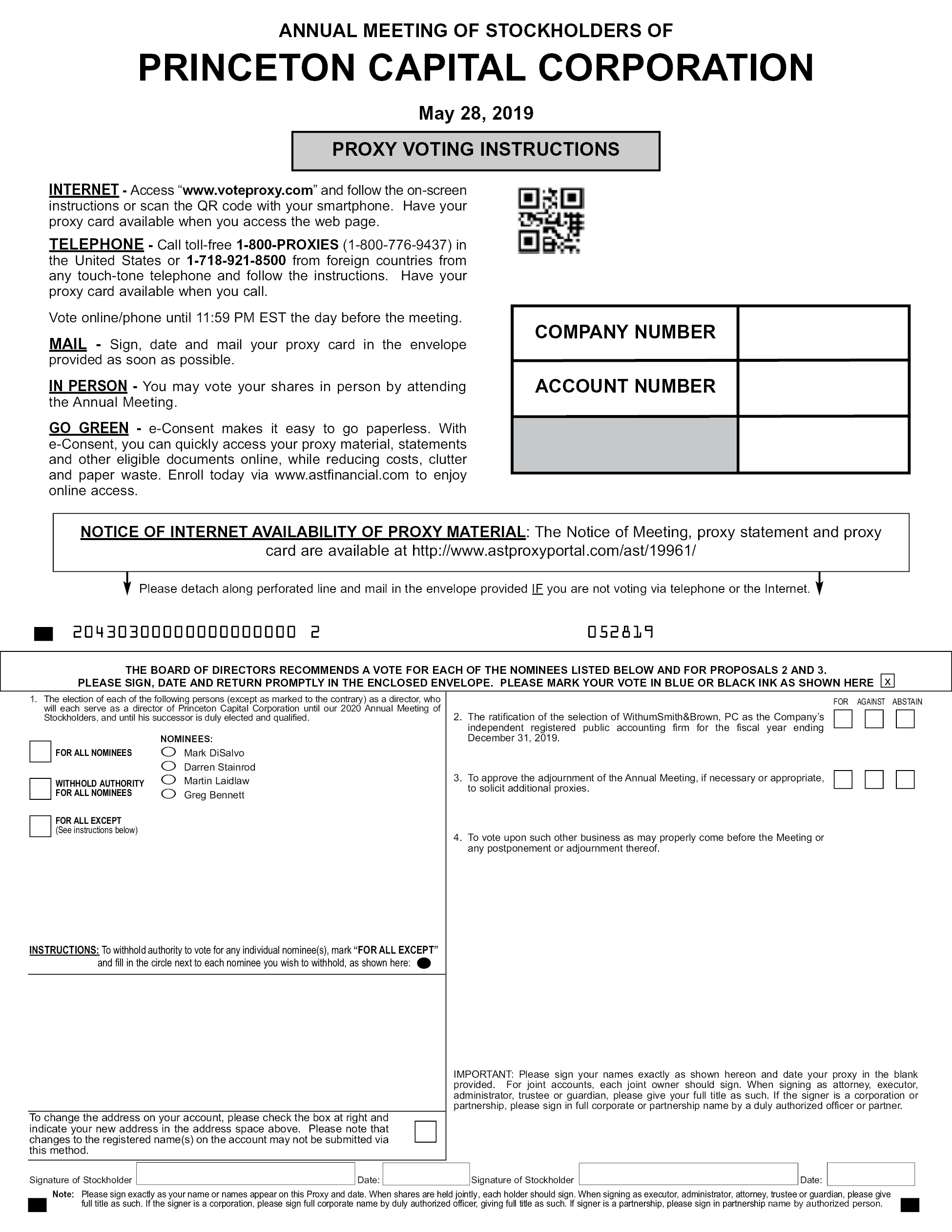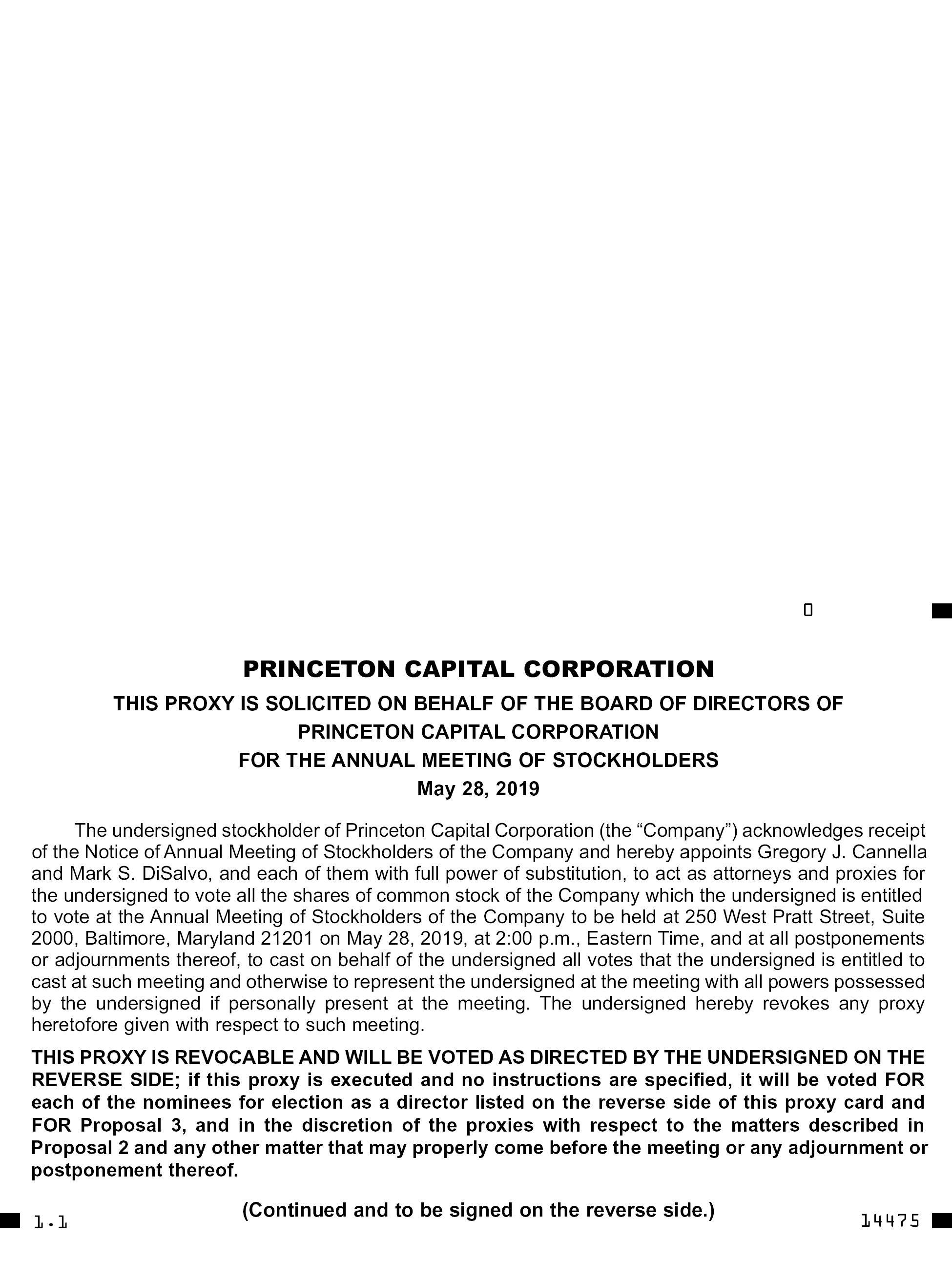 The enclosed proxy statement is also available at www.princetoncapitalcorp.com (under the “Investor Relations” section). This website also includes copies of the form of proxy and the Company’s Annual Report on Form 10-K for the year ended December 31, 2018 (the “Annual Report”). Stockholders may request a copy of the proxy statement and the Company’s Annual Report by contacting our main office at (978) 794-3366.