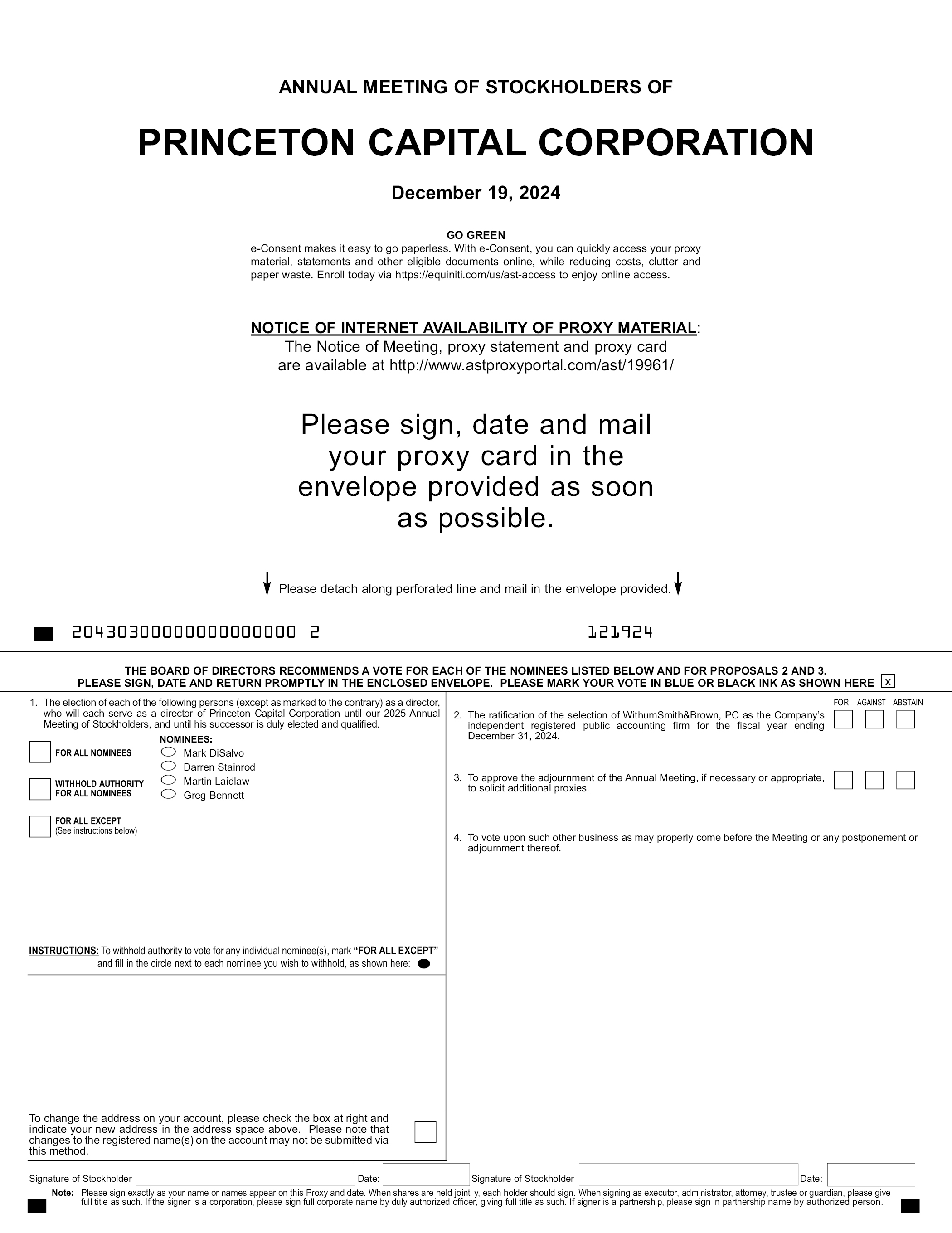 ANNUAL MEETING OF STOCKHOLDERS OF PRINCETON CAPITAL CORPORATION December 19, 2024 PROXY VOTING INSTRUCTIONS INTERNET - Access “www.voteproxy.com” and follow the on-screen instructions or scan the QR code with your smartphone. Have your proxy card available when you access the web page. TELEPHONE - Call toll-free 1-800-PROXIES (1-800-776-9437) in the United States or 1-201-299-4446 from foreign countries from any touch-tone telephone and follow the instructions. Have your proxy card available when you call. Vote online/phone until 11:59 PM EST the day before the meeting. MAIL - Sign, date and mail your proxy card in the envelope provided as soon as possible. IN PERSON - You may vote your shares in person by attending the Annual Meeting. GO GREEN - e-Consent makes it easy to go paperless. With e-Consent, you can quickly access your proxy material, statements and other eligible documents online, while reducing costs, clutter and paper waste. Enroll today via https://equiniti.com/us/ast-access to enjoy online access. COMPANY NUMBER ACCOUNT NUMBER NOTICE OF INTERNET AVAILABILITY OF PROXY MATERIAL: The Notice of Meeting, proxy statement and proxy card are available at http://www.astproxyportal.com/ast/19961/ Please detach along perforated line and mail in the envelope provided IF you are not voting via telephone or the Internet. 20430300000000000000 2 121924 THE BOARD OF DIRECTORS RECOMMENDS A VOTE FOR EACH OF THE NOMINEES LISTED BELOW AND FOR PROPOSALS 2 AND 3. PLEASE SIGN, DATE AND RETURN PROMPTLY IN THE ENCLOSED ENVELOPE. PLEASE MARK YOUR VOTE IN BLUE OR BLACK INK AS SHOWN HERE 1. The election of each of the following persons (except as marked to the contrary) as a director, who will each serve as a director of Princeton Capital Corporation until our 2025 Annual Meeting of Stockholders, and until his successor is duly elected and qualified. FOR ALL NOMINEES WITHHOLD AUTHORITY FOR ALL NOMINEES FOR ALL EXCEPT (See instructions below) NOMINEES: Mark DiSalvo Darren Stainrod Martin Laidlaw Greg Bennett FOR AGAINST ABSTAIN 2. The ratification of the selection of WithumSmith&Brown, PC as the Company’s independent registered public accounting firm for the fiscal year ending December 31, 2024. 3. To approve the adjournment of the Annual Meeting, if necessary or appropriate, to solicit additional proxies. 4. To vote upon such other business as may properly come before the Meeting or any postponement or adjournment thereof. INSTRUCTIONS: To withhold authority to vote for any individual nominee(s), mark “FOR ALL EXCEPT” and fill in the circle next to each nominee you wish to withhold, as shown here: To change the address on your account, please check the box at right and indicate your new address in the address space above. Please note that changes to the registered name(s) on the account may not be submitted via this method. Signature of Stockholder Date: Signature of Stockholder Date: Note: Please sign exactly as your name or names appear on this Proxy and date. When shares are held jointly, each holder should sign. When signing as executor, administrator, attorney, trustee or guardian, please give full title as such. If the signer is a corporation, please sign full corporate name by duly authorized officer, giving full title as such. If signer is a partnership, please sign in partnership name by authorized person.