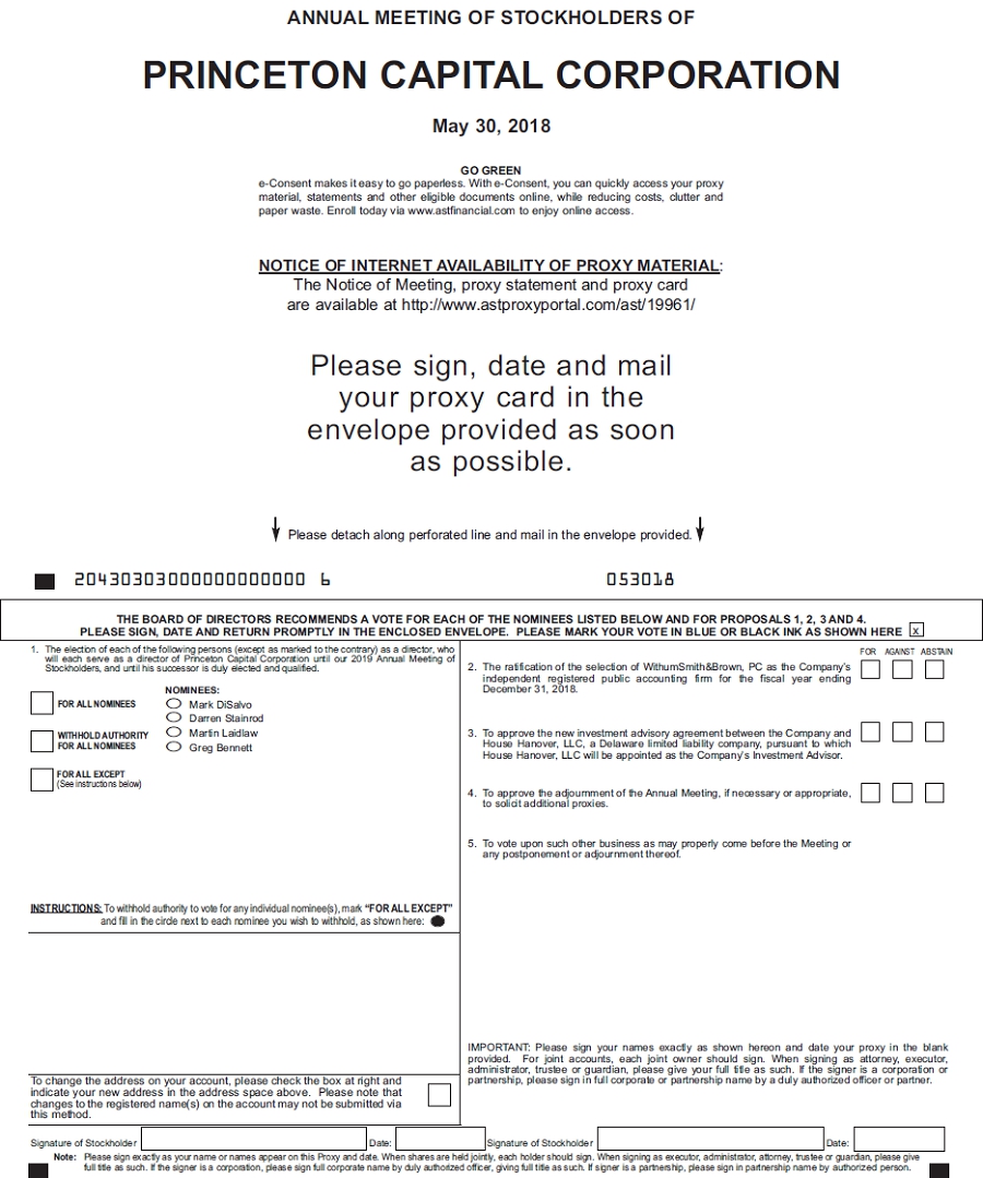 You are cordially invited to attend the 2018 Annual Meeting of Stockholders (the “Annual Meeting”) of Princeton Capital Corporation to be held on Wednesday, May 30, 2018 at 1:00pm, Eastern Time, at 250 West Pratt Street, Suite 2000, Baltimore, Maryland 21201. Only stockholders of record at the close of business on April 16, 2018 are entitled to the notice of, and to vote at, the Annual Meeting, including any postponement or adjournment thereof.