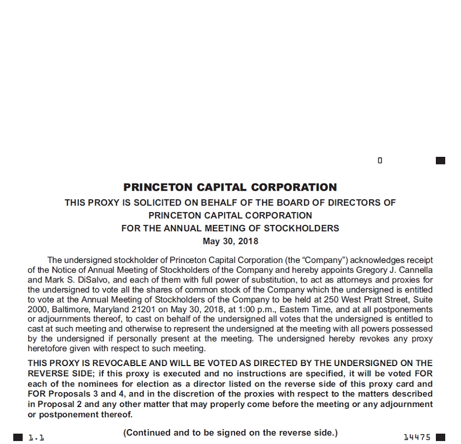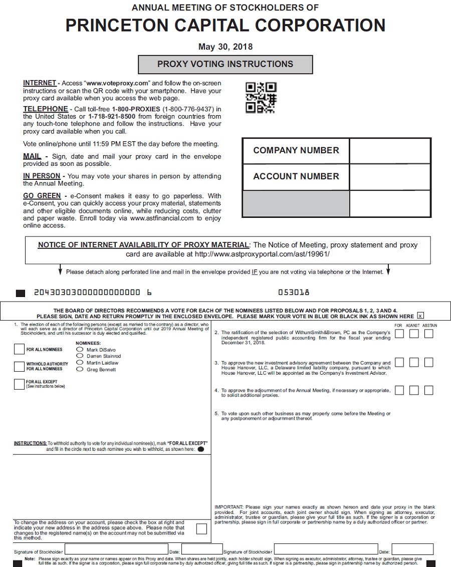 We encourage you to vote your shares, either by voting in person at the Annual Meeting or by granting a proxy (i.e., authorizing someone to vote your shares). If you properly sign and date the accompanying proxy card and the Company receives it in time for the Annual Meeting, the persons named as proxies will vote the shares registered directly in your name in the manner that you specified. This proxy statement is also available via the Internet at www.princetoncapitalcorp.com (under the “Investor Relations” section). The website also includes electronic copies of the form of proxy and the Annual Report.