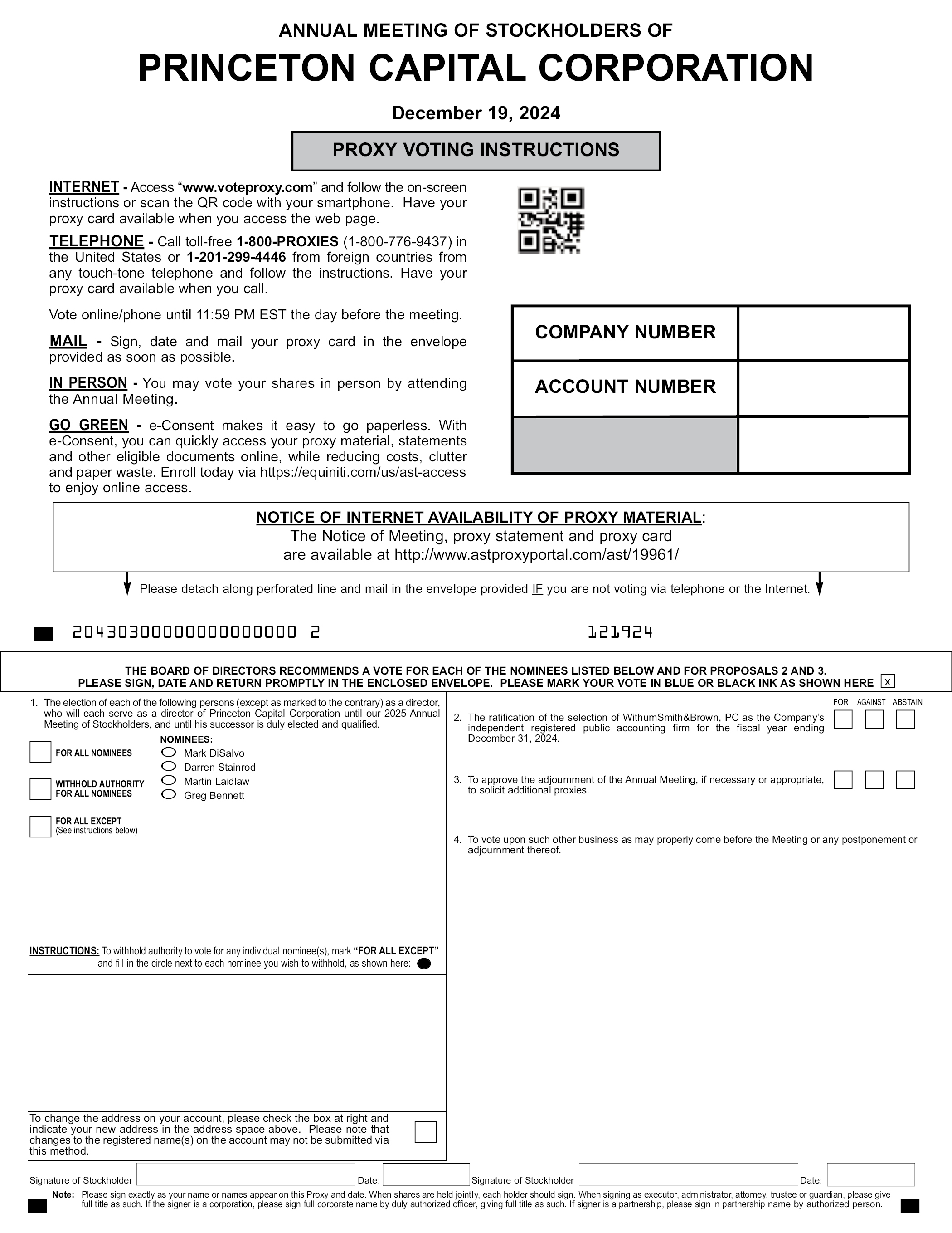 ANNUAL MEETING OF STOCKHOLDERS OF PRINCETON CAPITAL CORPORATION December 19, 2024 PROXY VOTING INSTRUCTIONS INTERNET - Access “www.voteproxy.com” and follow the on-screen instructions or scan the QR code with your smartphone. Have your proxy card available when you access the web page. TELEPHONE - Call toll-free 1-800-PROXIES (1-800-776-9437) in the United States or 1-201-299-4446 from foreign countries from any touch-tone telephone and follow the instructions. Have your proxy card available when you call. Vote online/phone until 11:59 PM EST the day before the meeting. MAIL - Sign, date and mail your proxy card in the envelope provided as soon as possible. IN PERSON - You may vote your shares in person by attending the Annual Meeting. GO GREEN - e-Consent makes it easy to go paperless. With e-Consent, you can quickly access your proxy material, statements and other eligible documents online, while reducing costs, clutter and paper waste. Enroll today via https://equiniti.com/us/ast-access to enjoy online access. COMPANY NUMBER ACCOUNT NUMBER NOTICE OF INTERNET AVAILABILITY OF PROXY MATERIAL: The Notice of Meeting, proxy statement and proxy card are available at http://www.astproxyportal.com/ast/19961/ Please detach along perforated line and mail in the envelope provided IF you are not voting via telephone or the Internet. 20430300000000000000 2 121924 THE BOARD OF DIRECTORS RECOMMENDS A VOTE FOR EACH OF THE NOMINEES LISTED BELOW AND FOR PROPOSALS 2 AND 3. PLEASE SIGN, DATE AND RETURN PROMPTLY IN THE ENCLOSED ENVELOPE. PLEASE MARK YOUR VOTE IN BLUE OR BLACK INK AS SHOWN HERE 1. The election of each of the following persons (except as marked to the contrary) as a director, who will each serve as a director of Princeton Capital Corporation until our 2025 Annual Meeting of Stockholders, and until his successor is duly elected and qualified. FOR ALL NOMINEES WITHHOLD AUTHORITY FOR ALL NOMINEES FOR ALL EXCEPT (See instructions below) NOMINEES: Mark DiSalvo Darren Stainrod Martin Laidlaw Greg Bennett FOR AGAINST ABSTAIN 2. The ratification of the selection of WithumSmith&Brown, PC as the Company’s independent registered public accounting firm for the fiscal year ending December 31, 2024. 3. To approve the adjournment of the Annual Meeting, if necessary or appropriate, to solicit additional proxies. 4. To vote upon such other business as may properly come before the Meeting or any postponement or adjournment thereof. INSTRUCTIONS: To withhold authority to vote for any individual nominee(s), mark “FOR ALL EXCEPT” and fill in the circle next to each nominee you wish to withhold, as shown here: To change the address on your account, please check the box at right and indicate your new address in the address space above. Please note that changes to the registered name(s) on the account may not be submitted via this method. Signature of Stockholder Date: Signature of Stockholder Date: Note: Please sign exactly as your name or names appear on this Proxy and date. When shares are held jointly, each holder should sign. When signing as executor, administrator, attorney, trustee or guardian, please give full title as such. If the signer is a corporation, please sign full corporate name by duly authorized officer, giving full title as such. If signer is a partnership, please sign in partnership name by authorized person.