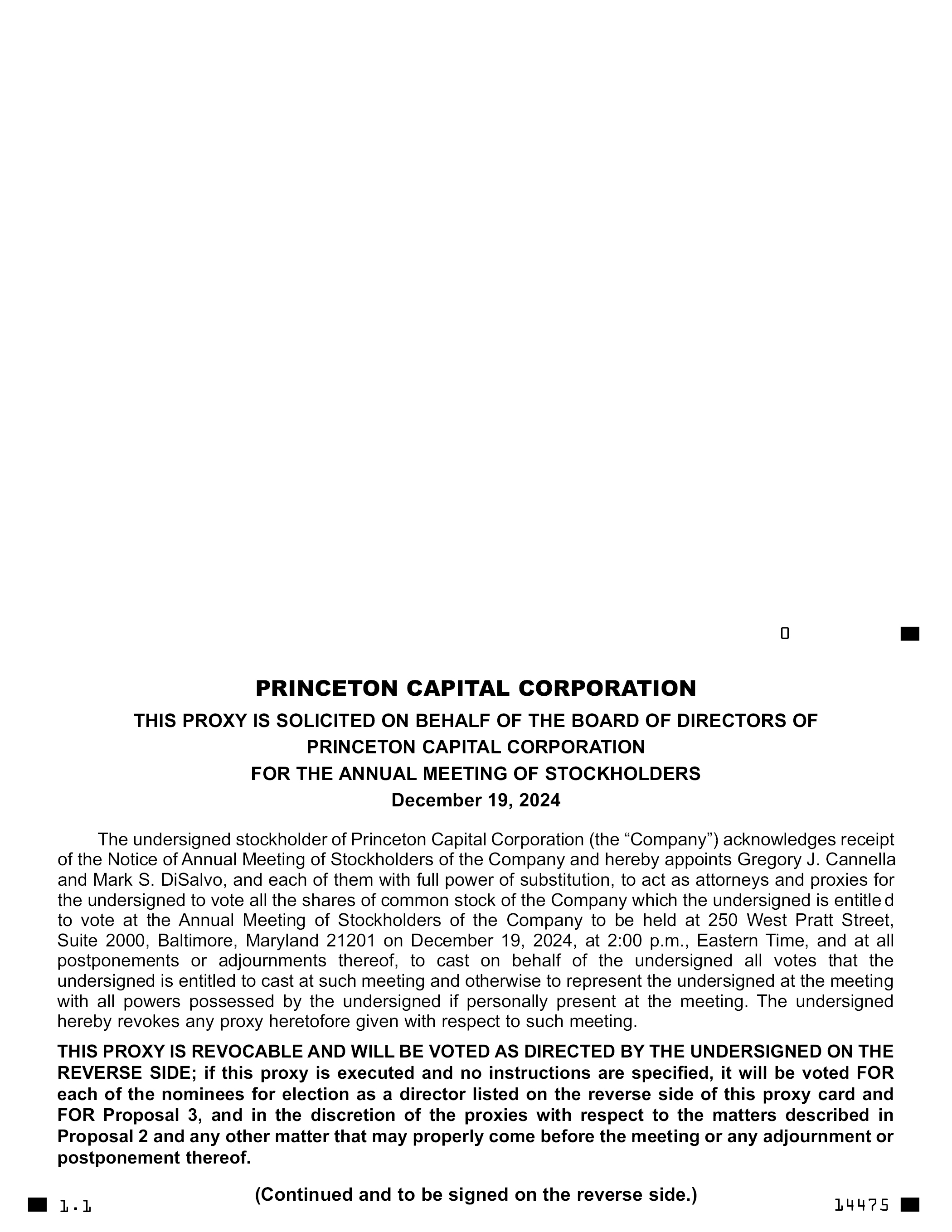PRINCETON CAPITAL CORPORATION THIS PROXY IS SOLICITED ON BEHALF OF THE BOARD OF DIRECTORS OF PRINCETON CAPITAL CORPORATION FOR THE ANNUAL MEETING OF STOCKHOLDERS December 19, 2024 the Notice of Annual Meeting of Stockholders of the Company and hereby appoints Gregory J. Cannella and Mark S. DiSalvo, and each of them with full power of substitution, to act as attorneys and proxies for the undersigned to vote all the shares of common stock of the Company which the undersigned is entitled to vote at the Annual Meeting of Stockholders of the Company to be held at 250 West Pratt Street, Suite 2000, Baltimore, Maryland 21201 on December 19, 2024, at 2:00 p.m., Eastern Time, and at all postponements or adjournments thereof, to cast on behalf of the undersigned all votes that the undersigned is entitled to cast at such meeting and otherwise to represent the undersigned at the meeting with all powers possessed by the undersigned if personally present at the meeting. The undersigned hereby revokes any proxy heretofore given with respect to such meeting. THIS PROXY IS REVOCABLE AND WILL BE VOTED AS DIRECTED BY THE UNDERSIGNED ON THE REVERSE SIDE; if this proxy is executed and no instructions are specified, it will be voted FOR each of the nominees for election as a director listed on the reverse side of this proxy card and FOR Proposal 3, and in the discretion of the proxies with respect to the matters described in Proposal 2 and any other matter that may properly come before the meeting or any adjournment or postponement thereof. (Continued and to be signed on the reverse side.) 1.1 14475