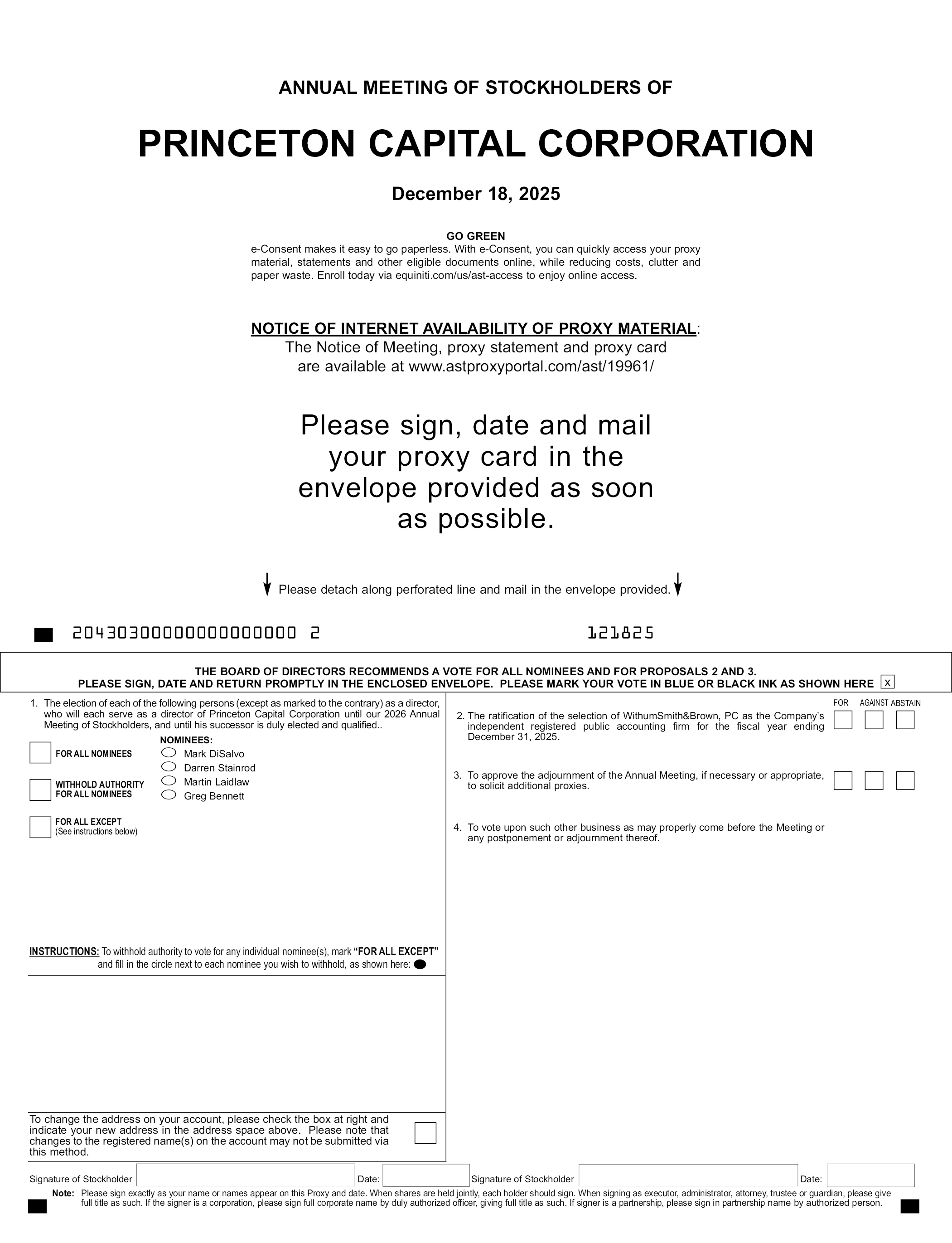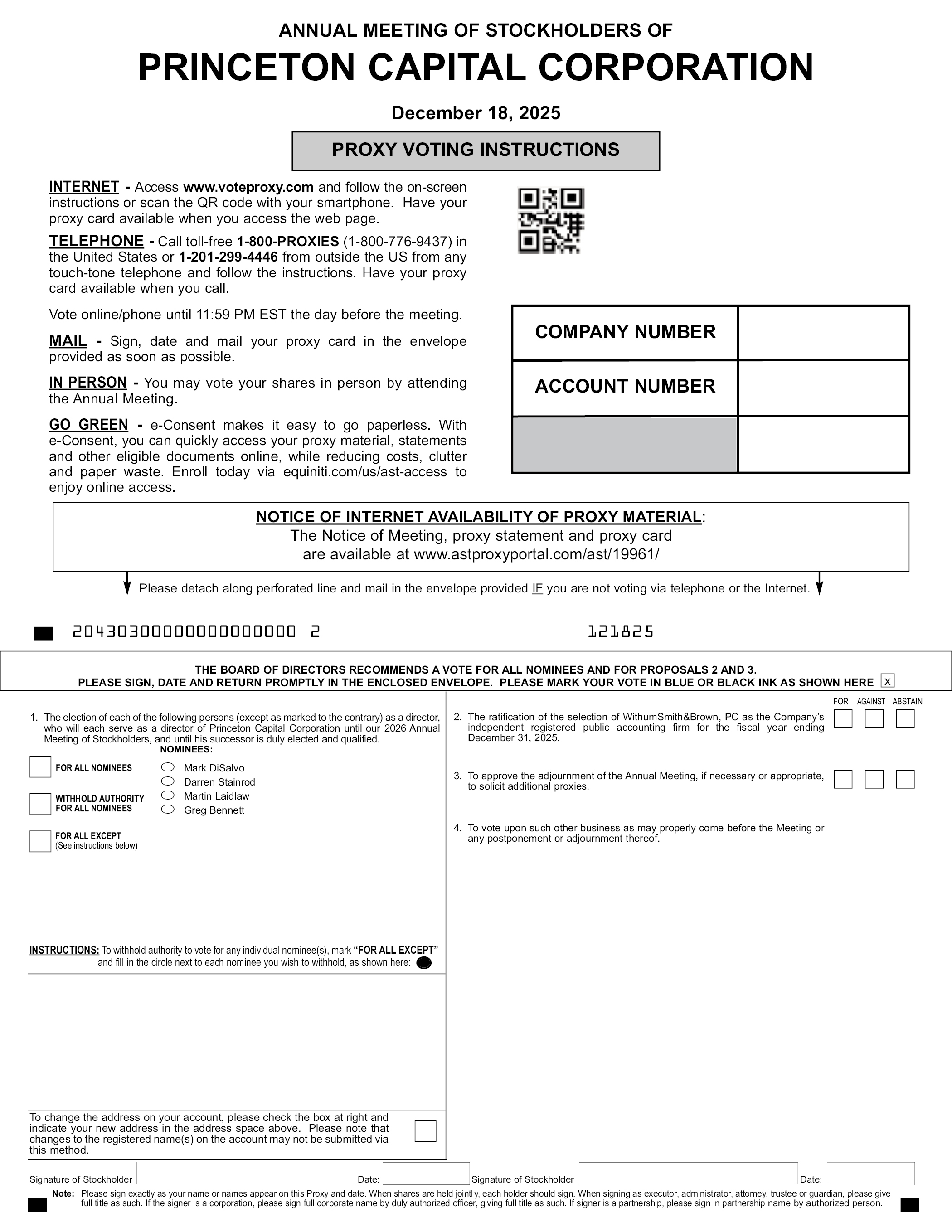 ANNUAL MEETING OF STOCKHOLDERS OF PRINCETON CAPITAL CORPORATION December 18, 2025 GO GREEN e-Consent makes it easy to go paperless. With e-Consent, you can quickly access your proxy material, statements and other eligible documents online, while reducing costs, clutter and paper waste. Enroll today via equiniti.com/us/ast-access to enjoy online access. NOTICE OF INTERNET AVAILABILITY OF PROXY MATERIAL: The Notice of Meeting, proxy statement and proxy card are available at www.astproxyportal.com/ast/19961/ Please sign, date and mail your proxy card in the envelope provided as soon as possible. Please detach along perforated line and mail in the envelope provided. 20430300000000000000 2 121825 THE BOARD OF DIRECTORS RECOMMENDS A VOTE FOR ALL NOMINEES AND FOR PROPOSALS 2 AND 3. PLEASE SIGN, DATE AND RETURN PROMPTLY IN THE ENCLOSED ENVELOPE. PLEASE MARK YOUR VOTE IN BLUE OR BLACK INK AS SHOWN HERE 1. The election of each of the following persons (except as marked to the contrary) as a director, who will each serve as a director of Princeton Capital Corporation until our 2026 Annual Meeting of Stockholders, and until his successor is duly elected and qualified.. FOR ALL NOMINEES WITHHOLD AUTHORITY FOR ALL NOMINEES FOR ALL EXCEPT (See instructions below) O Mark DiSalvo O Darren Stainrod O Martin Laidlaw O Greg Bennett NOMINEES: INSTRUCTIONS: To withhold authority to vote for any individual nominee(s), mark “FOR ALL EXCEPT” and fill in the circle next to each nominee you wish to withhold, as shown here: 2. The ratification of the selection of WithumSmith&Brown, PC as the Company’s independent registered public accounting firm for the fiscal year ending December 31, 2025. 3. To approve the adjournment of the Annual Meeting, if necessary or appropriate, to solicit additional proxies. 4. To vote upon such other business as may properly come before the Meeting or any postponement or adjournment thereof. FOR AGAINST ABSTAIN