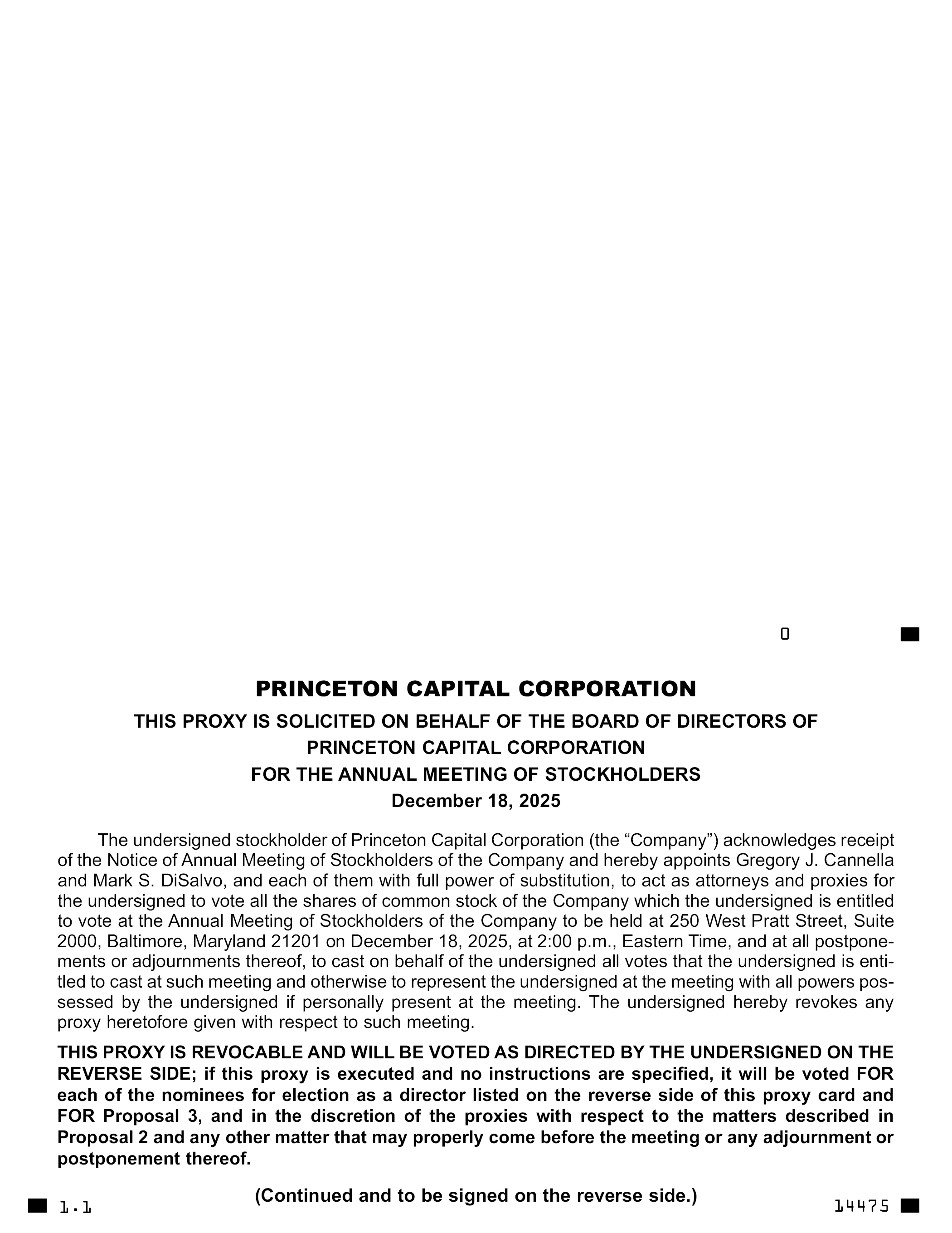 PRINCETON CAPITAL CORPORATION THIS PROXY IS SOLICITED ON BEHALF OF THE BOARD OF DIRECTORS OF PRINCETON CAPITAL CORPORATION FOR THE ANNUAL MEETING OF STOCKHOLDERS December 18, 2025 The undersigned stockholder of Princeton Capital Corporation (the “Company”) acknowledges receipt of the Notice of Annual Meeting of Stockholders of the Company and hereby appoints Gregory J. Cannella and Mark S. DiSalvo, and each of them with full power of substitution, to act as attorneys and proxies for the undersigned to vote all the shares of common stock of the Company which the undersigned is entitled to vote at the Annual Meeting of Stockholders of the Company to be held at 250 West Pratt Street, Suite 2000, Baltimore, Maryland 21201 on December 18, 2025, at 2:00 p.m., Eastern Time, and at all postponements or adjournments thereof, to cast on behalf of the undersigned all votes that the undersigned is entitled to cast at such meeting and otherwise to represent the undersigned at the meeting with all powers possessed by the undersigned if personally present at the meeting. The undersigned hereby revokes any proxy heretofore given with respect to such meeting. THIS PROXY IS REVOCABLE AND WILL BE VOTED AS DIRECTED BY THE UNDERSIGNED ON THE REVERSE SIDE; if this proxy is executed and no instructions are specified, it will be voted FOR each of the nominees for election as a director listed on the reverse side of this proxy card and FOR Proposal 3, and in the discretion of the proxies with respect to the matters described in Proposal 2 and any other matter that may properly come before the meeting or any adjournment or postponement thereof. (Continued and to be signed on the reverse side.) 14475 1.1